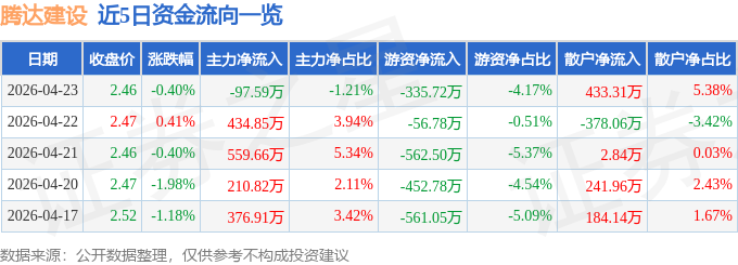 证券之星消息,截至2026年4月23日收盘,腾达建设(600512)报收于2.46元,下跌0.4%,换手率2.06%,成交量32.68万手,成交额8053.79万元。