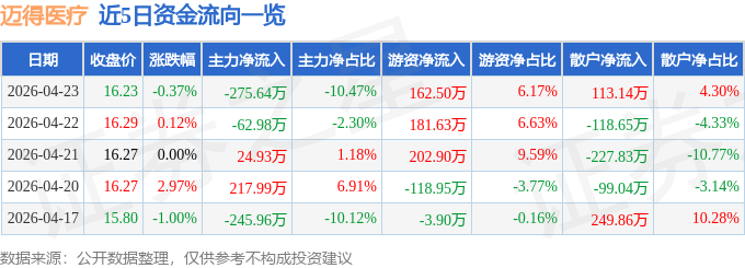 证券之星消息,截至2026年4月23日收盘,迈得医疗(688310)报收于16.23元,下跌0.37%,换手率0.99%,成交量1.63万手,成交额2632.33万元。