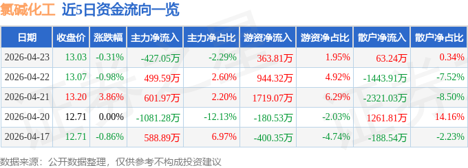 证券之星消息,截至2026年4月23日收盘,氯碱化工(600618)报收于13.03元,下跌0.31%,换手率1.91%,成交量14.3万手,成交额1.86亿元。