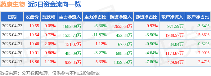 证券之星消息,截至2026年4月23日收盘,药康生物(688046)报收于19.55元,上涨0.05%,换手率3.25%,成交量13.31万手,成交额2.67亿元。