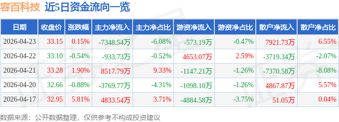 证券之星消息,截至2026年4月23日收盘,容百科技(688005)报收于33.15元,上涨0.15%,换手率5.14%,成交量36.74万手,成交额12.09亿元。