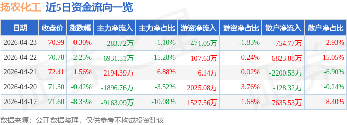 证券之星消息,截至2026年4月23日收盘,扬农化工(600486)报收于70.99元,上涨0.3%,换手率0.9%,成交量3.63万手,成交额2.57亿元。