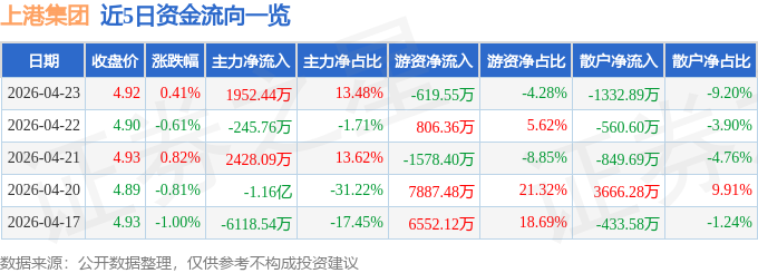证券之星消息,截至2026年4月23日收盘,上港集团(600018)报收于4.92元,上涨0.41%,换手率0.13%,成交量29.5万手,成交额1.45亿元。