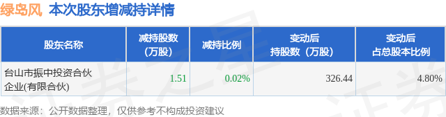 证券之星消息,4月23日绿岛风发布公告《绿岛风:关于股东股份减持计划期限届满暨实施情况的公告》,其股东台山市振中投资合伙企业(有限合伙)于2026年3月17日至2026年3月18日间合计减持1.51万股,占公司目前总股本的0.0222%,变动期间该股股价下跌1.75%,截止3月18日收盘报58.96元。