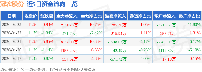 证券之星消息,截至2026年4月23日收盘,冠农股份(600251)报收于11.9元,上涨0.93%,换手率2.96%,成交量22.96万手,成交额2.73亿元。
