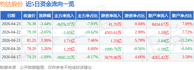 证券之星消息,截至2026年4月23日收盘,钧达股份(002865)报收于76.38元,下跌3.44%,换手率6.18%,成交量13.82万手,成交额10.69亿元。