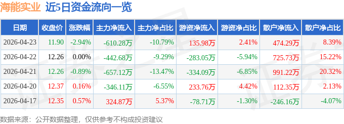 证券之星消息,截至2026年4月23日收盘,海能实业(300787)报收于11.9元,下跌2.94%,换手率2.39%,成交量4.71万手,成交额5653.86万元。