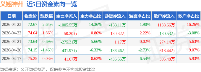 4月23日的资金流向数据方面,主力资金净流出1005.55万元,占总成交额14.36%,游资资金净流出133.11万元,占总成交额1.9%,散户资金净流入1138.66万元,占总成交额16.26%。