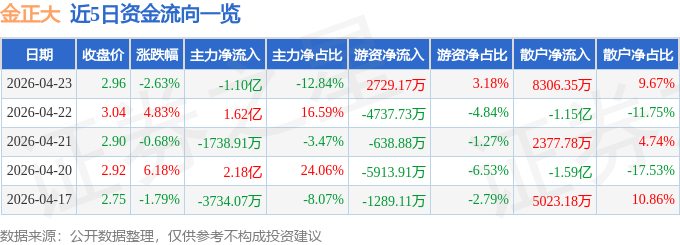 证券之星消息,截至2026年4月23日收盘,金正大(002470)报收于2.96元,下跌2.63%,换手率8.87%,成交量291.6万手,成交额8.59亿元。