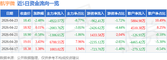 证券之星消息,截至2026年4月23日收盘,航宇微(300053)报收于18.45元,下跌2.48%,换手率4.62%,成交量30.05万手,成交额5.61亿元。