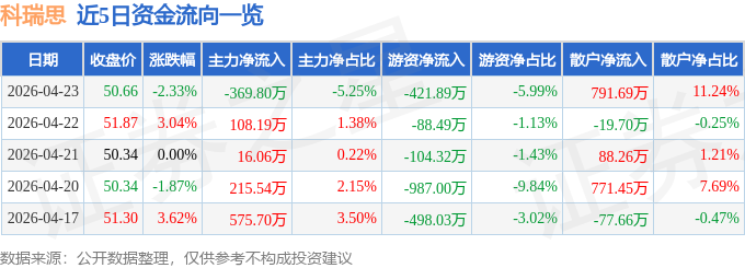 证券之星消息,截至2026年4月23日收盘,科瑞思(301314)报收于50.66元,下跌2.33%,换手率7.53%,成交量1.38万手,成交额7046.53万元。