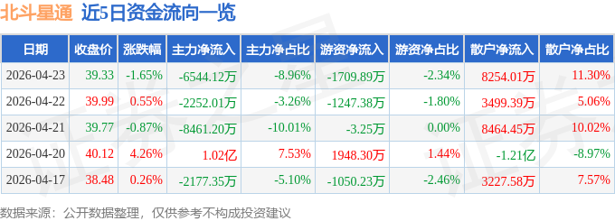 证券之星消息,截至2026年4月23日收盘,北斗星通(002151)报收于39.33元,下跌1.65%,换手率4.16%,成交量18.42万手,成交额7.31亿元。