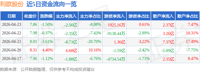 证券之星消息,截至2026年4月23日收盘,利欧股份(002131)报收于7.86元,下跌1.5%,换手率6.79%,成交量397.83万手,成交额31.7亿元。