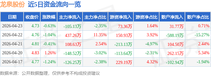 证券之星消息,截至2026年4月23日收盘,龙泉股份(002671)报收于4.73元,下跌0.63%,换手率1.72%,成交量9.48万手,成交额4481.96万元。