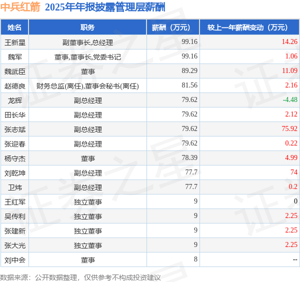 证券之星消息,中兵红箭发布2025年年报,数据显示:公司主营收入92.74亿元,同比增102.97%。归母净利润为4169.6万元,同比增112.74%。扣非净利润为3236.82万元,同比增109.31%。当年公司员工总数8419人,同比增1.19%。人均薪酬18.34万元(注:"人均薪酬"根据定期报告中"应付职工薪酬"附注的本期增加值 / 员工总数计算而来),同比增10.26%。人均创收110.15万元,同比增100.58%。人均创利0.72万元,同比增116.26%。其中管理层薪酬总额为965.44万元,同比上一年减19.16%,薪酬最高的为副董事长,总经理王新星,薪酬99.16万元。