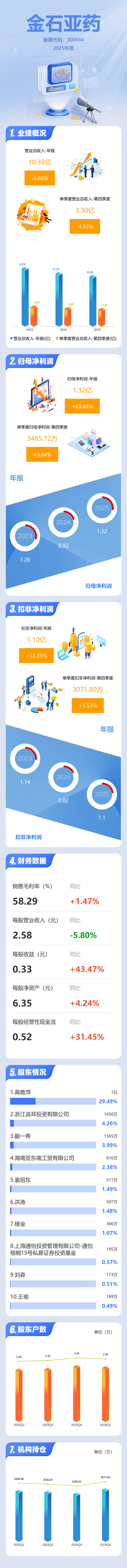 证券之星消息,金石亚药2025年年报显示,当年度公司主营收入10.38亿元,同比下降5.8%;归母净利润1.32亿元,同比上升43.44%;扣非净利润1.1亿元,同比上升33.34%;其中2025年第四季度,公司单季度主营收入3.3亿元,同比下降4.56%;单季度归母净利润3485.72万元,同比上升3.64%;单季度扣非净利润3071.8万元,同比上升1.54%;负债率20.2%,投资收益-762.4万元,财务费用-86.21万元,毛利率58.29%。