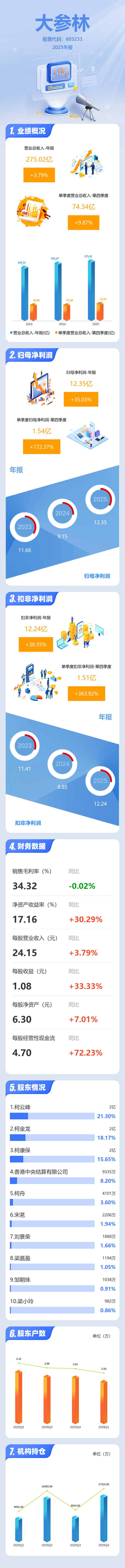 证券之星消息,大参林2025年年报显示,当年度公司主营收入275.02亿元,同比上升3.8%;归母净利润12.35亿元,同比上升35.04%;扣非净利润12.24亿元,同比上升38.36%;其中2025年第四季度,公司单季度主营收入74.34亿元,同比上升9.88%;单季度归母净利润1.54亿元,同比上升172.37%;单季度扣非净利润1.51亿元,同比上升363.93%;负债率67.3%,投资收益32.52万元,财务费用1.49亿元,毛利率34.32%。