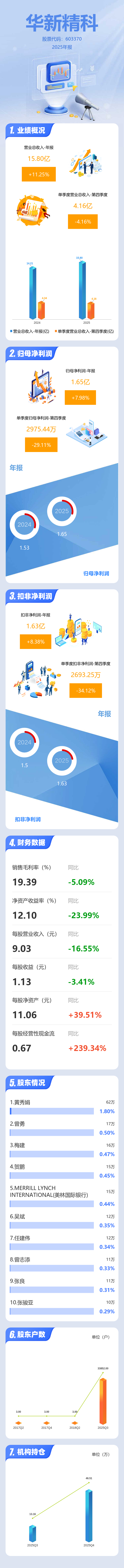 证券之星消息,华新精科2025年年报显示,当年度公司主营收入15.8亿元,同比上升11.26%;归母净利润1.65亿元,同比上升7.99%;扣非净利润1.63亿元,同比上升8.39%;其中2025年第四季度,公司单季度主营收入4.16亿元,同比下降4.16%;单季度归母净利润2975.44万元,同比下降29.12%;单季度扣非净利润2693.25万元,同比下降34.13%;负债率27.69%,投资收益63.23万元,财务费用-800.57万元,毛利率19.39%。