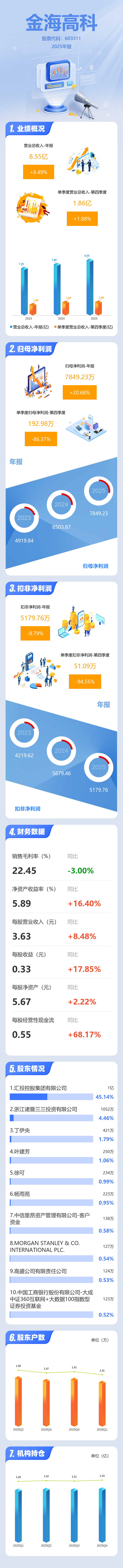 证券之星消息,金海高科2025年年报显示,当年度公司主营收入8.55亿元,同比上升8.49%;归母净利润7849.23万元,同比上升20.69%;扣非净利润5179.76万元,同比下降8.8%;其中2025年第四季度,公司单季度主营收入1.86亿元,同比上升1.88%;单季度归母净利润192.98万元,同比下降86.37%;单季度扣非净利润51.09万元,同比下降94.56%;负债率24.13%,投资收益410.57万元,财务费用48.63万元,毛利率22.45%。