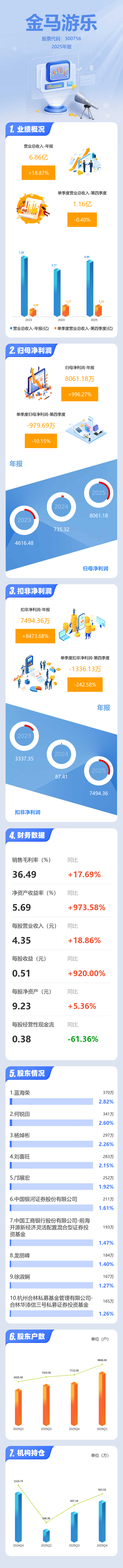 证券之星消息,金马游乐2025年年报显示,当年度公司主营收入6.86亿元,同比上升18.87%;归母净利润8061.18万元,同比上升996.27%;扣非净利润7494.36万元,同比上升8473.69%;其中2025年第四季度,公司单季度主营收入1.16亿元,同比下降0.4%;单季度归母净利润-979.69万元,同比下降10.16%;单季度扣非净利润-1336.13万元,同比下降242.58%;负债率37.36%,投资收益632.66万元,财务费用-2535.76万元,毛利率36.49%。