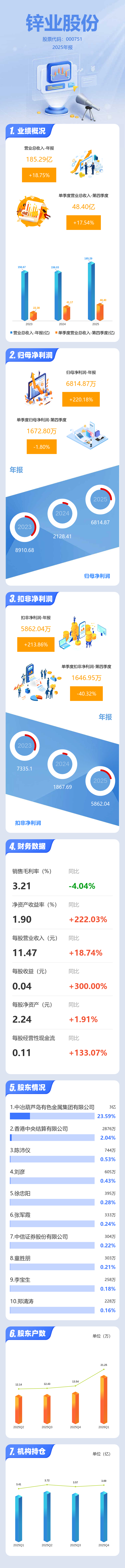 证券之星消息,锌业股份2025年年报显示,当年度公司主营收入185.29亿元,同比上升18.76%;归母净利润6814.87万元,同比上升220.19%;扣非净利润5862.04万元,同比上升213.87%;其中2025年第四季度,公司单季度主营收入48.4亿元,同比上升17.55%;单季度归母净利润1672.8万元,同比下降1.8%;单季度扣非净利润1646.95万元,同比下降40.33%;负债率62.75%,投资收益473.57万元,财务费用2.09亿元,毛利率3.21%。