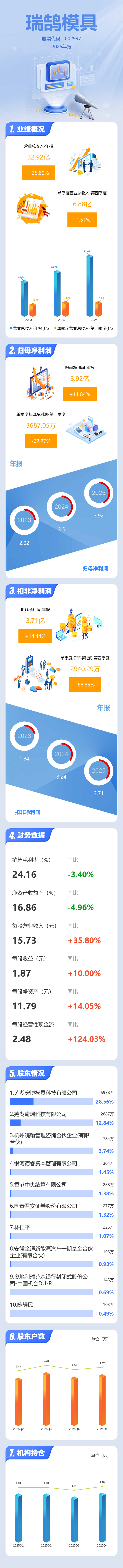 证券之星消息,瑞鹄模具2025年年报显示,当年度公司主营收入32.92亿元,同比上升35.8%;归母净利润3.92亿元,同比上升11.85%;扣非净利润3.71亿元,同比上升14.45%;其中2025年第四季度,公司单季度主营收入6.88亿元,同比下降1.51%;单季度归母净利润3687.05万元,同比下降62.28%;单季度扣非净利润2940.29万元,同比下降68.86%;负债率60.68%,投资收益7206.25万元,财务费用-69.46万元,毛利率24.16%。