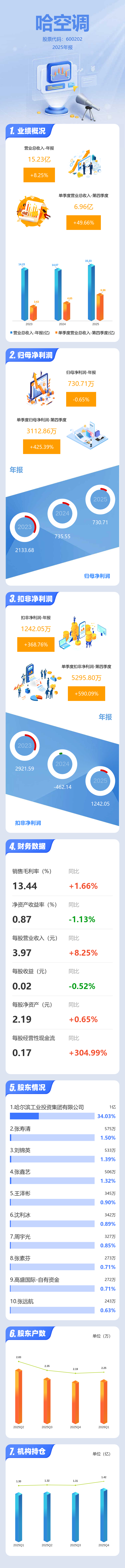 证券之星消息,哈空调2025年年报显示,当年度公司主营收入15.23亿元,同比上升8.25%;归母净利润730.71万元,同比下降0.66%;扣非净利润1242.05万元,同比上升368.76%;其中2025年第四季度,公司单季度主营收入6.96亿元,同比上升49.66%;单季度归母净利润3112.86万元,同比上升425.39%;单季度扣非净利润5295.8万元,同比上升590.1%;负债率68.92%,投资收益-32.4万元,财务费用2834.89万元,毛利率13.44%。