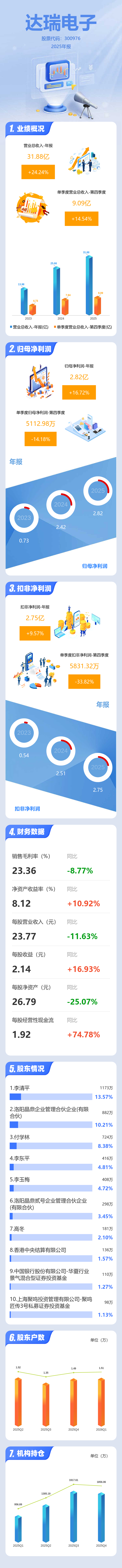 证券之星消息,达瑞电子2025年年报显示,当年度公司主营收入31.88亿元,同比上升24.24%;归母净利润2.82亿元,同比上升16.72%;扣非净利润2.75亿元,同比上升9.57%;其中2025年第四季度,公司单季度主营收入9.09亿元,同比上升14.54%;单季度归母净利润5112.98万元,同比下降14.19%;单季度扣非净利润5831.32万元,同比下降33.83%;负债率20.45%,投资收益1332.86万元,财务费用-388.73万元,毛利率23.36%。