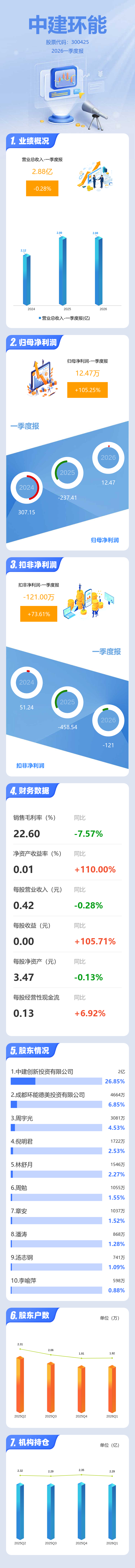 证券之星消息,中建环能2026年一季报显示,一季度公司主营收入2.88亿元,同比下降0.28%;归母净利润12.47万元,同比上升105.25%;扣非净利润-121.0万元,同比上升73.61%;负债率44.57%,投资收益25.36万元,财务费用453.01万元,毛利率22.6%。