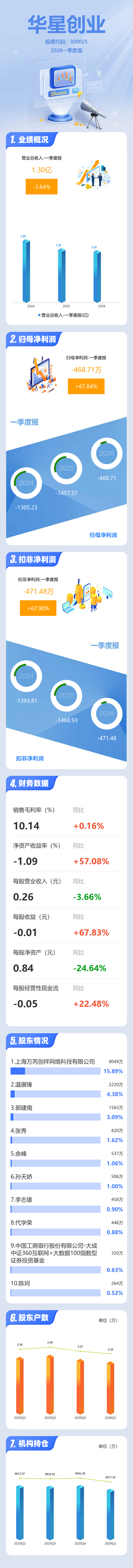 证券之星消息,华星创业2026年一季报显示,一季度公司主营收入1.3亿元,同比下降3.65%;归母净利润-468.71万元,同比上升67.84%;扣非净利润-471.48万元,同比上升67.9%;负债率41.79%,财务费用154.52万元,毛利率10.14%。