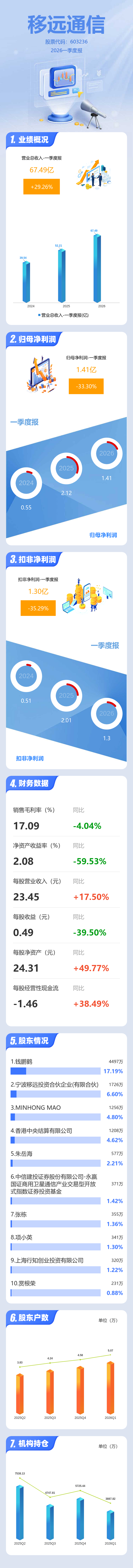 证券之星消息,移远通信2026年一季报显示,一季度公司主营收入67.49亿元,同比上升29.26%;归母净利润1.41亿元,同比下降33.3%;扣非净利润1.3亿元,同比下降35.29%;负债率63.25%,投资收益56.97万元,财务费用2885.83万元,毛利率17.09%。