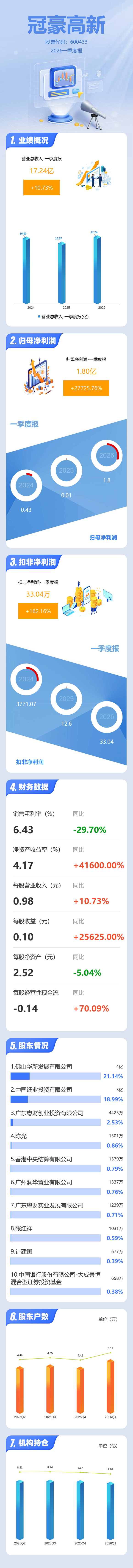 证券之星消息,冠豪高新2026年一季报显示,一季度公司主营收入17.24亿元,同比上升10.74%;归母净利润1.8亿元,同比上升27725.76%;扣非净利润33.04万元,同比上升162.16%;负债率48.57%,投资收益443.34万元,财务费用1785.7万元,毛利率6.43%。