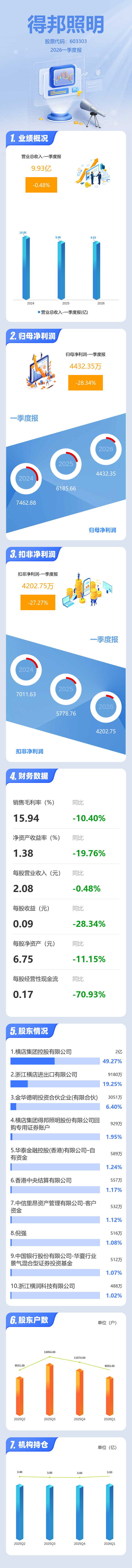 证券之星消息,得邦照明2026年一季报显示,一季度公司主营收入9.93亿元,同比下降0.49%;归母净利润4432.35万元,同比下降28.34%;扣非净利润4202.75万元,同比下降27.27%;负债率43.39%,投资收益191.77万元,财务费用1482.55万元,毛利率15.94%。