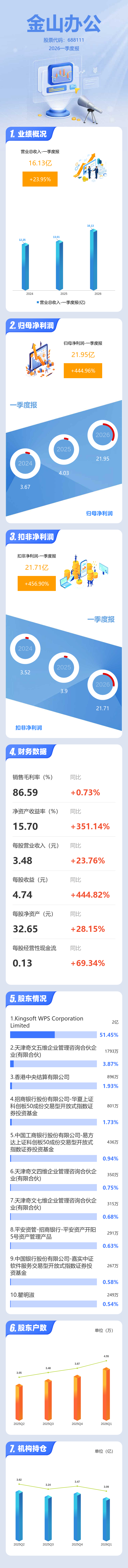 证券之星消息,金山办公2026年一季报显示,一季度公司主营收入16.13亿元,同比上升23.95%;归母净利润21.95亿元,同比上升444.97%;扣非净利润21.71亿元,同比上升456.91%;负债率25.16%,投资收益19.37亿元,财务费用-142.16万元,毛利率86.59%。