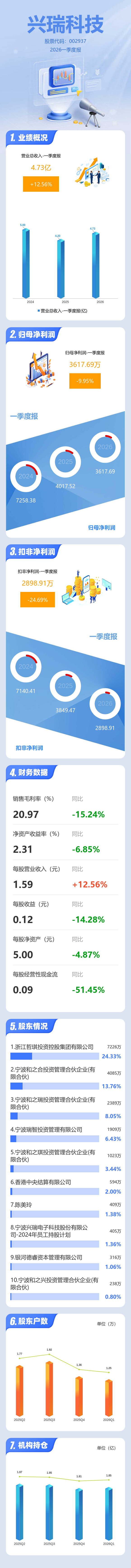 证券之星消息,兴瑞科技2026年一季报显示,一季度公司主营收入4.73亿元,同比上升12.57%;归母净利润3617.69万元,同比下降9.95%;扣非净利润2898.91万元,同比下降24.69%;负债率39.78%,投资收益781.09万元,财务费用1182.98万元,毛利率20.97%。