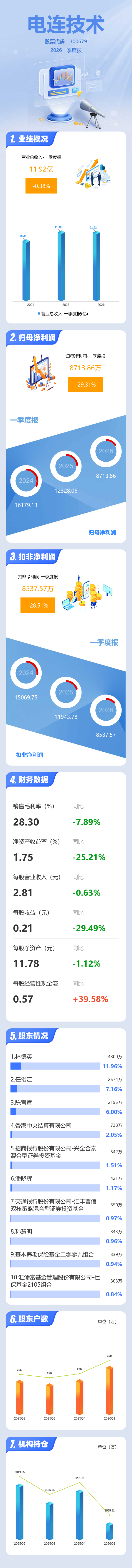 证券之星消息,电连技术2026年一季报显示,一季度公司主营收入11.92亿元,同比下降0.39%;归母净利润8713.86万元,同比下降29.32%;扣非净利润8537.57万元,同比下降28.52%;负债率30.7%,投资收益93.28万元,财务费用1548.25万元,毛利率28.3%。