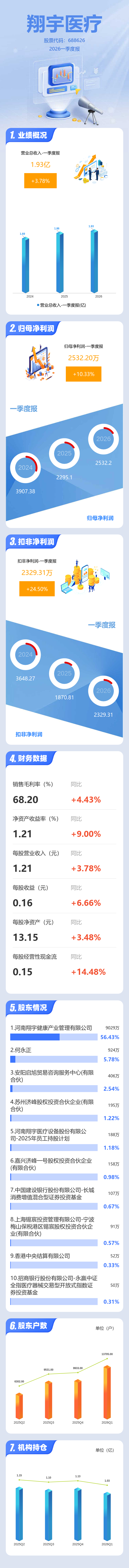 证券之星消息,翔宇医疗2026年一季报显示,一季度公司主营收入1.93亿元,同比上升3.78%;归母净利润2532.2万元,同比上升10.33%;扣非净利润2329.31万元,同比上升24.51%;负债率37.24%,投资收益-132.71万元,财务费用-167.21万元,毛利率68.2%。