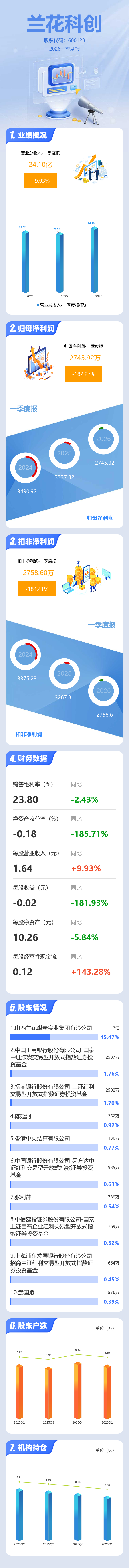 证券之星消息,兰花科创2026年一季报显示,一季度公司主营收入24.1亿元,同比上升9.94%;归母净利润-2745.92万元,同比下降182.28%;扣非净利润-2758.6万元,同比下降184.42%;负债率60.54%,投资收益-4298.57万元,财务费用1.04亿元,毛利率23.8%。
