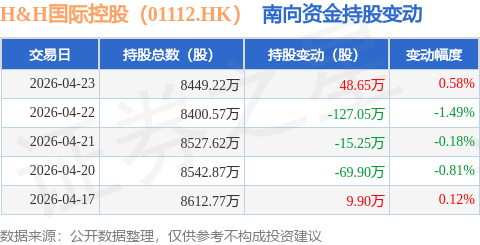 证券之星消息,4月23日南向资金增持48.65万股H&H国际控股(01112.HK)。近5个交易日中,获南向资金减持的有3天,累计净减持153.65万股。近20个交易日中,获南向资金减持的有15天,累计净减持987.45万股。截至目前,南向资金持有H&H国际控股(01112.HK)8449.22万股,占公司已发行普通股的13.08%。