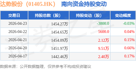 证券之星消息,4月23日南向资金减持3800.0股达势股份(01405.HK)。近5个交易日中,获南向资金增持的有4天,累计净增持14.21万股。近20个交易日中,获南向资金增持的有15天,累计净增持149.57万股。截至目前,南向资金持有达势股份(01405.HK)1454.27万股,占公司已发行普通股的11.04%。