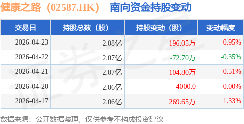 证券之星消息,4月23日南向资金增持196.05万股健康之路(02587.HK)。近5个交易日中,获南向资金增持的有4天,累计净增持498.2万股。近20个交易日中,获南向资金增持的有14天,累计净增持588.65万股。截至目前,南向资金持有健康之路(02587.HK)2.08亿股,占公司已发行普通股的23.74%。
