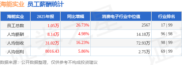 证券之星消息,4月24日海能实业公布2025年年报,当年营收32.59亿元,同比增47.3%;净利润为9469.1万元,同比增23.47%。根据财报数据披露,当年公司员工总数10506人,同比增26.73%;人均薪酬8.14万元,同比增4.98%;人均创收31.02万元,同比增16.23%;人均创利0.8万元,同比增5.86%;公司员工薪酬统计见下表: