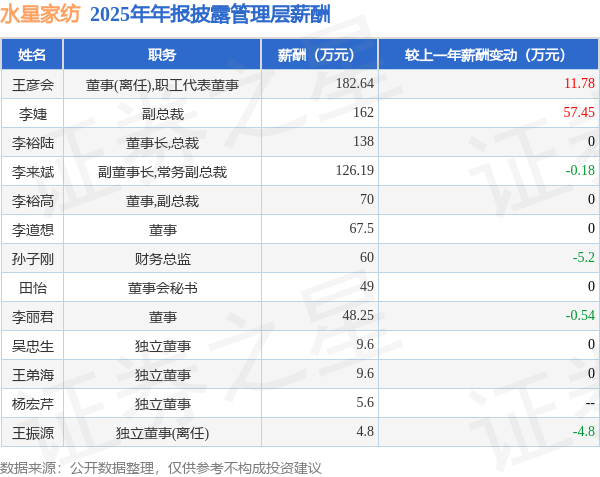 证券之星消息,水星家纺发布2025年年报,数据显示:公司主营收入45.28亿元,同比增7.99%。归母净利润为4.07亿元,同比增10.96%。扣非净利润为3.54亿元,同比增6.29%。当年公司员工总数3270人,同比减4.91%。人均薪酬19.11万元(注:"人均薪酬"根据定期报告中"应付职工薪酬"附注的本期增加值 / 员工总数计算而来),同比增7.77%。人均创收138.48万元,同比增13.57%。人均创利12.44万元,同比增16.67%。其中管理层薪酬总额为933.18万元,同比上一年减8.61%,薪酬最高的为董事(离任),职工代表董事王彦会,薪酬182.64万元。