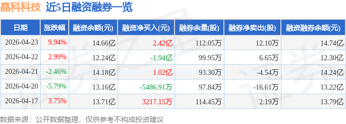 晶科科技融资融券信息显示,融资方面,当日融资买入7.63亿元,融资偿还5.2亿元,融资净买入2.42亿元,净买入额两市排名第5。融券方面,融券卖出14.12万股,融券偿还2.02万股,融券余量112.05万股,融券余额805.64万元。融资融券余额14.74亿元。