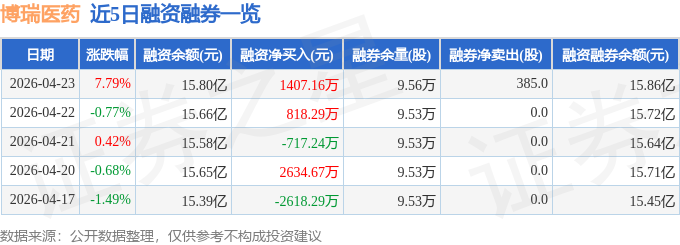 证券之星消息,截至2026年4月23日收盘,博瑞医药(688166)报收于61.18元,上涨7.79%,换手率5.21%,成交量22.06万手,成交额12.99亿元。