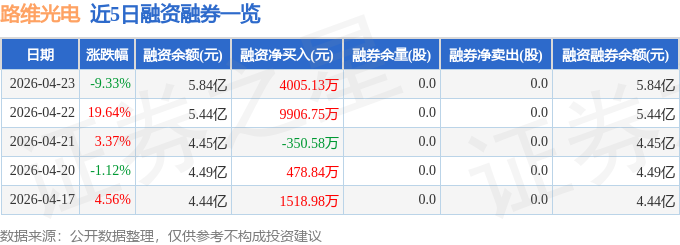 路维光电融资融券信息显示,融资方面,当日融资买入1.51亿元,融资偿还1.11亿元,融资净买入4005.13万元。融券方面,融券卖出0.0股,融券偿还0.0股,融券余量0.0股,融券余额0.0万元。融资融券余额5.84亿元。