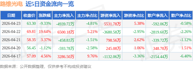 证券之星消息,截至2026年4月23日收盘,路维光电(688401)报收于63.3元,下跌9.33%,换手率8.34%,成交量16.12万手,成交额10.28亿元。
