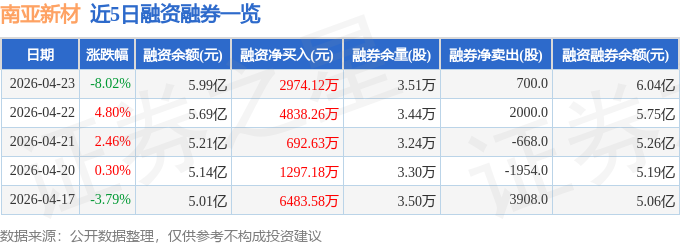 证券之星消息,截至2026年4月23日收盘,南亚新材(688519)报收于147.12元,下跌8.02%,换手率3.75%,成交量8.8万手,成交额13.12亿元。
