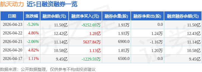 证券之星消息,截至2026年4月23日收盘,航天动力(600343)报收于36.38元,下跌5.26%,换手率8.71%,成交量55.59万手,成交额20.56亿元。
