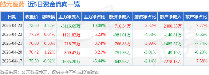 证券之星消息,截至2026年4月23日收盘,皓元医药(688131)报收于73.8元,下跌4.52%,换手率1.95%,成交量4.13万手,成交额3.09亿元。